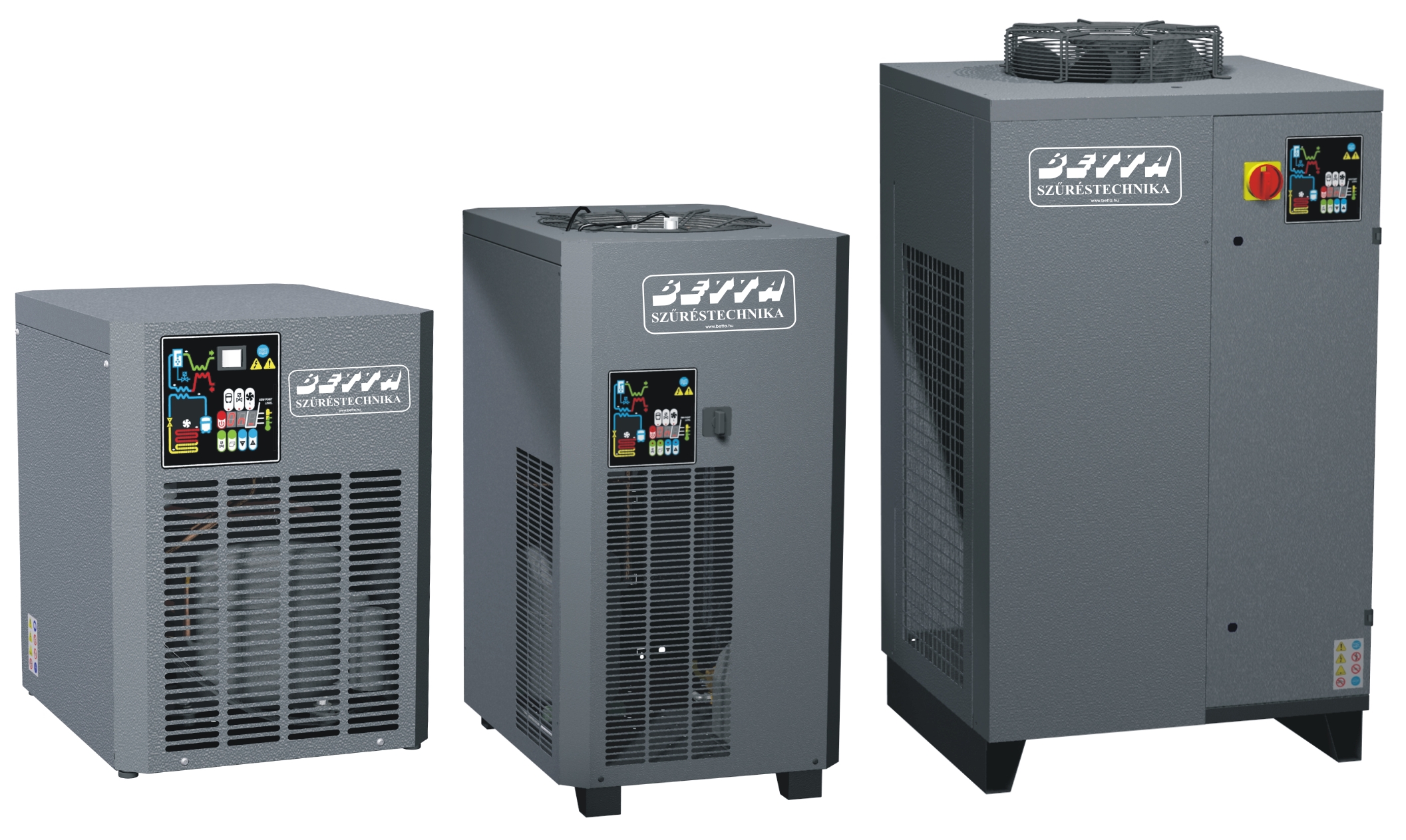 - Végül egy hűtveszárítót (a maradék 30%-ból kivon 27-29%-ot – tehát e két rendszerrel a víztartalom 97-99%-át kiszűrtük)